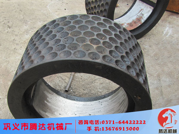 壓球機輥皮是壓球機型煤設(shè)備中必不可少的一個重要構(gòu)件,壓球機輥皮決定了壓球機壓制成型的形狀,壓球機輥皮是包括在壓球機輥芯外部的一層表層挖有球窩的圓筒形狀的構(gòu)件。根據(jù)裝配方式的不同分為一體式和分裝式。