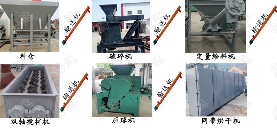 【主要設(shè)備】:定量給料機(jī)、粉碎機(jī)、雙軸攪拌機(jī)、粘合劑攪拌桶(干粉粘合劑給料機(jī))、型煤壓球機(jī)、型煤烘干機(jī)